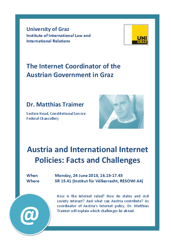 Das Institut für Völkerrecht und Internationale Beziehungen der Karl-Franzens-Universität Graz und sein Focal Point on Internet Governance and Human Rights lädt ein zu einem Vortrag (in englischer Sprache) des Internetkoordinators der österreichischen Bundesregierung: