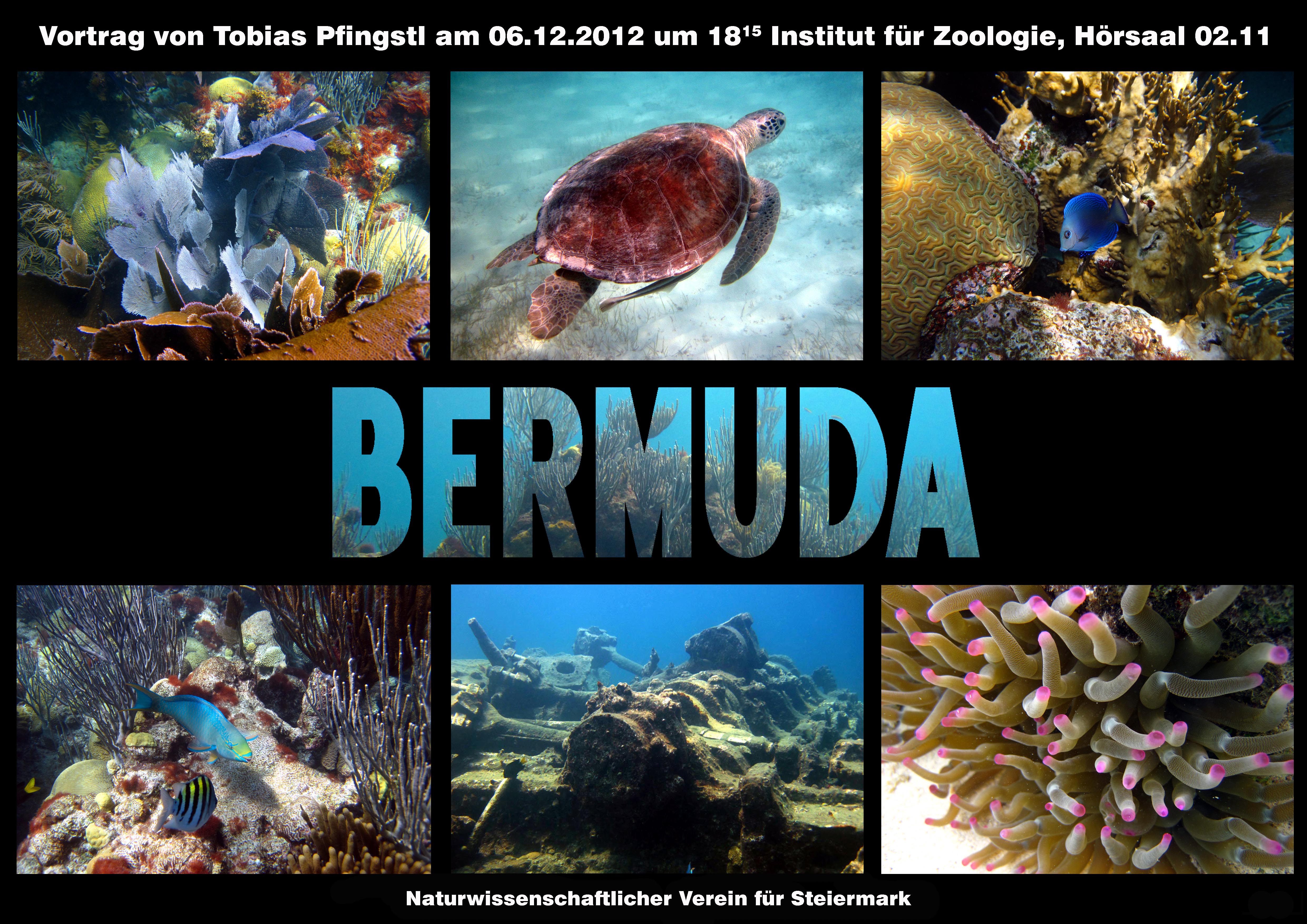 Der Grazer Zoologe Dr. Tobias Pfingstl verbrachte ein Jahr am Bermuda Institute of Ocean Sciences um dort zu forschen. Im zweiten Teil seiner Vortragsreihe über Bermuda präsentiert er anhand zahlreicher Fotos die spannende Welt unterhalb der Wasseroberfläche. Die Gewässer rund um Bermuda sind charakterisiert durch die nördlichsten Korallenriffe der Welt, zahlreiche Schiffswracks und eine enorme Farbenvielfalt des Tierreiches. Wer dem grauen Herbstwetter kurz entfliehen möchte, sollte sich diesen Vortrag nicht entgehen lassen und mit dem Vortragenden in die subtropischen Untiefen Bermuda's abtauchen.
