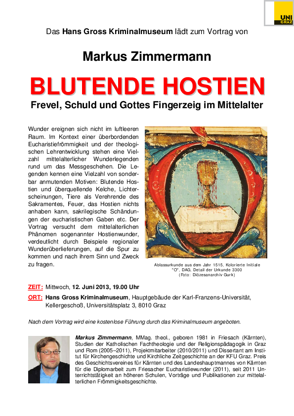 Wunder ereignen sich nicht im luftleeren Raum. Im Kontext einer überbordenden Eucharistiefrömmigkeit und der theologischen Lehrentwicklung stehen eine Vielzahl mittelalterlicher Wunderlegenden rund um das Messgeschehen. Die Legenden kennen eine Vielzahl von sonderbar anmutenden Motiven: Blutende Hostien und überquellende Kelche, Lichterscheinungen, Tiere als Verehrende des Sakramentes, Feuer, das Hostien nichts anhaben kann, sakrilegische Schändungen der eucharistischen Gaben etc. Der Vortrag des Theologen Markus Zimmermann versucht dem mittelalterlichen Phänomen sogenannter Hostienwunder, verdeutlicht durch Beispiele regionaler Wunderüberlieferungen, auf die Spur zu kommen und nach ihrem Sinn und Zweck zu fragen.