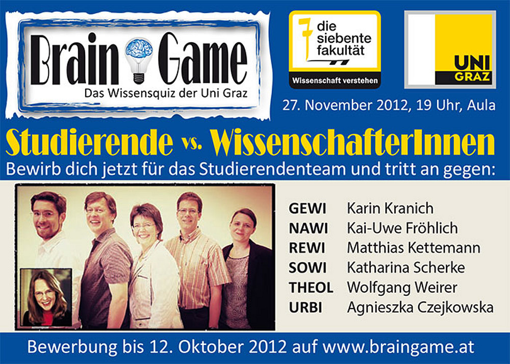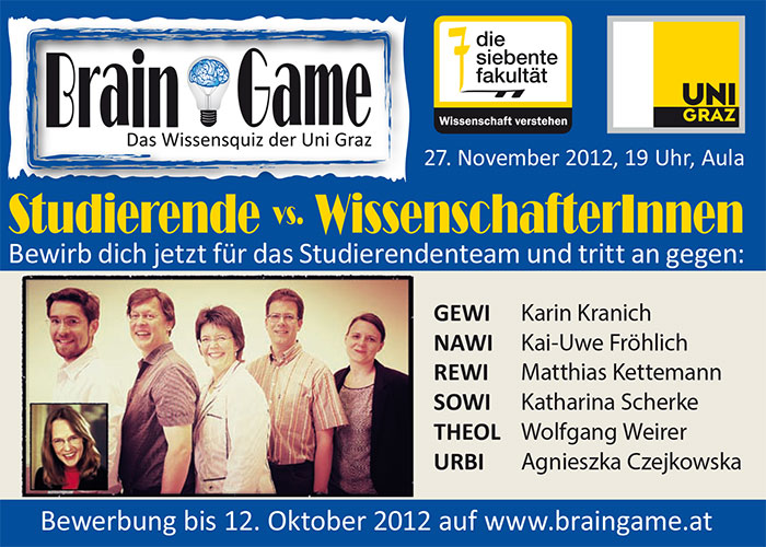 Die 7. fakultät - das Zentrum für Gesellschaft, Wissen und Kommunikation veranstaltet auch heuer wieder "Braingame". Bei diesem Wissensquiz der Uni Graz treten sechs Studierende gegen sechs WissenschafterInnen an und liefern sich in der Aula der Uni Graz einen Wettkampf auf höchstem Niveau. Spannung garantiert.