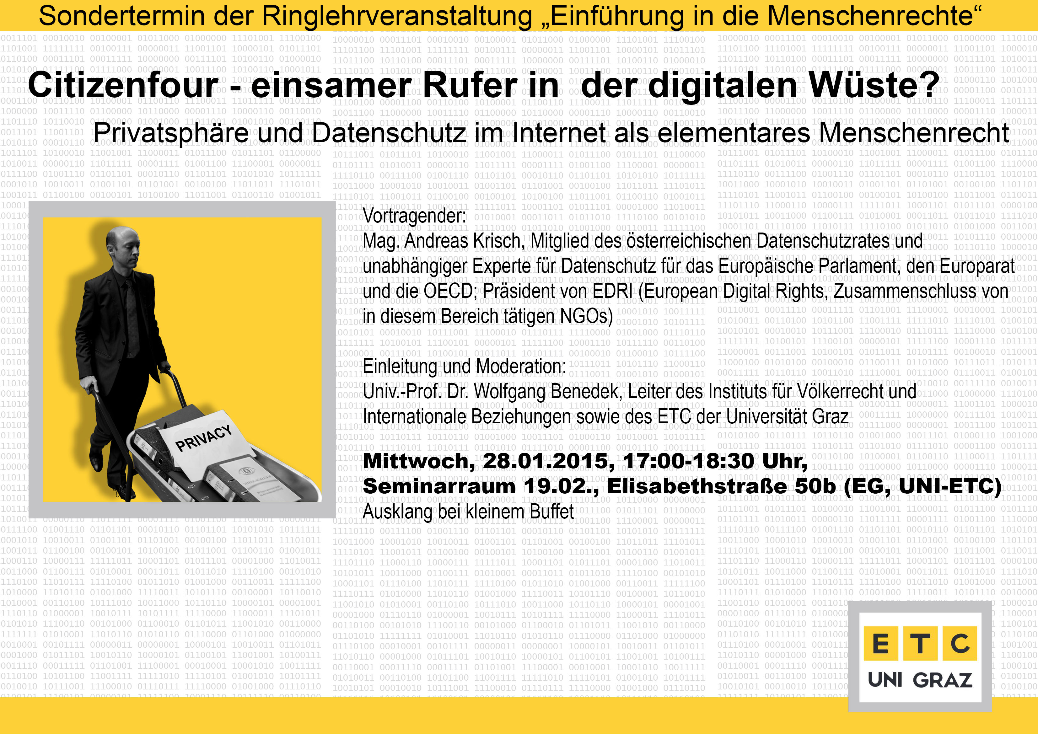 Mag. Andreas Krisch, Mitglied des österreichischen Datenschutzrates und unabhängiger Experte für Datenschutz für das Europäische Parlament, den Europarat und OECD und Präsident von European Digital Rights, diskutiert mit Univ.-Prof. Wolfgang Benedek über neueste Entwicklungen und Problemstellungen in Bezug auf den Schutz von Daten im Internet
