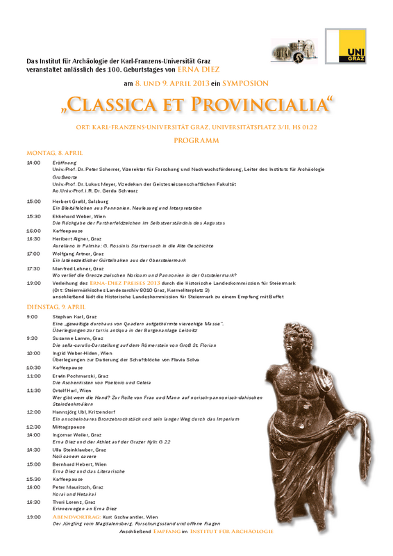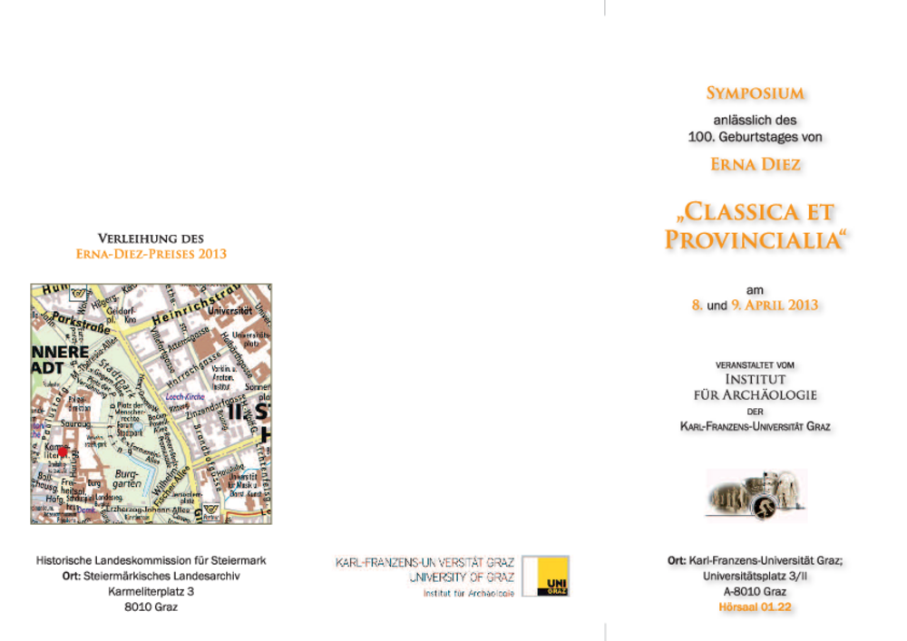 Anlässlich des 100. Geburtstages von Erna Diez (1913-2001), der langjährigen Ordinaria des Instituts für Archäologie, am 8. April 2013 veranstaltet das Institut das Symposium „Classica et Provincialia“. Die Konferenz, in deren Rahmen in Kooperation mit der Historischen Landeskommission für Steiermark auch der diesjährige Erna-Diez Preis für hervorragende Forschungen auf dem Gebiet der Archäologie verliehen wird, findet am 8. und 9. April an der Karl-Franzens-Universität Graz statt.
