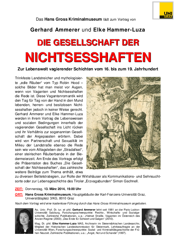Trinkfeste Landstreicher und mythologisierte „edle Räuber“ vom Typ Robin Hood – solche Bilder hat man meist vor Augen, wenn von Vaganten und Nichtsesshaften die Rede ist. Diese Vagantenromantik wird den Tag für Tag von der Hand in den Mund lebenden, herren- und besitzlosen Nichtsesshaften jedoch in keiner Weise gerecht. Gerhard Ammerer und Elke Hammer-Luza werden in ihrem Vortrag die Lebensweisen und sozialen Bedingungen innerhalb der vagierenden Gesellschaft ins Licht rücken und ihr Verhältnis zur sogenannten Gesellschaft der Angepassten erörtern. Dabei wird von Partnerschaft und Sexualität im Milieu der Landstraße ebenso die Rede sein wie vom Alltagsleben der „Stradafisel“, einer steirischen Räuberbande in der Biedermeierzeit. Am Ende des Vortrags erfolgt die Präsentation des Buches „Die Gesellschaft der Nichtsesshaften“, das zahlreiche weitere Beiträge zum Thema enthält, etwa zu diversen Bettelstrategien, zur Rolle der Wirtshäuser als Kommunikations- und Sehnsuchtsorte oder zur Lebensgeschichte des Tiroler „Erzvagabunden“ Simon Gschnell.