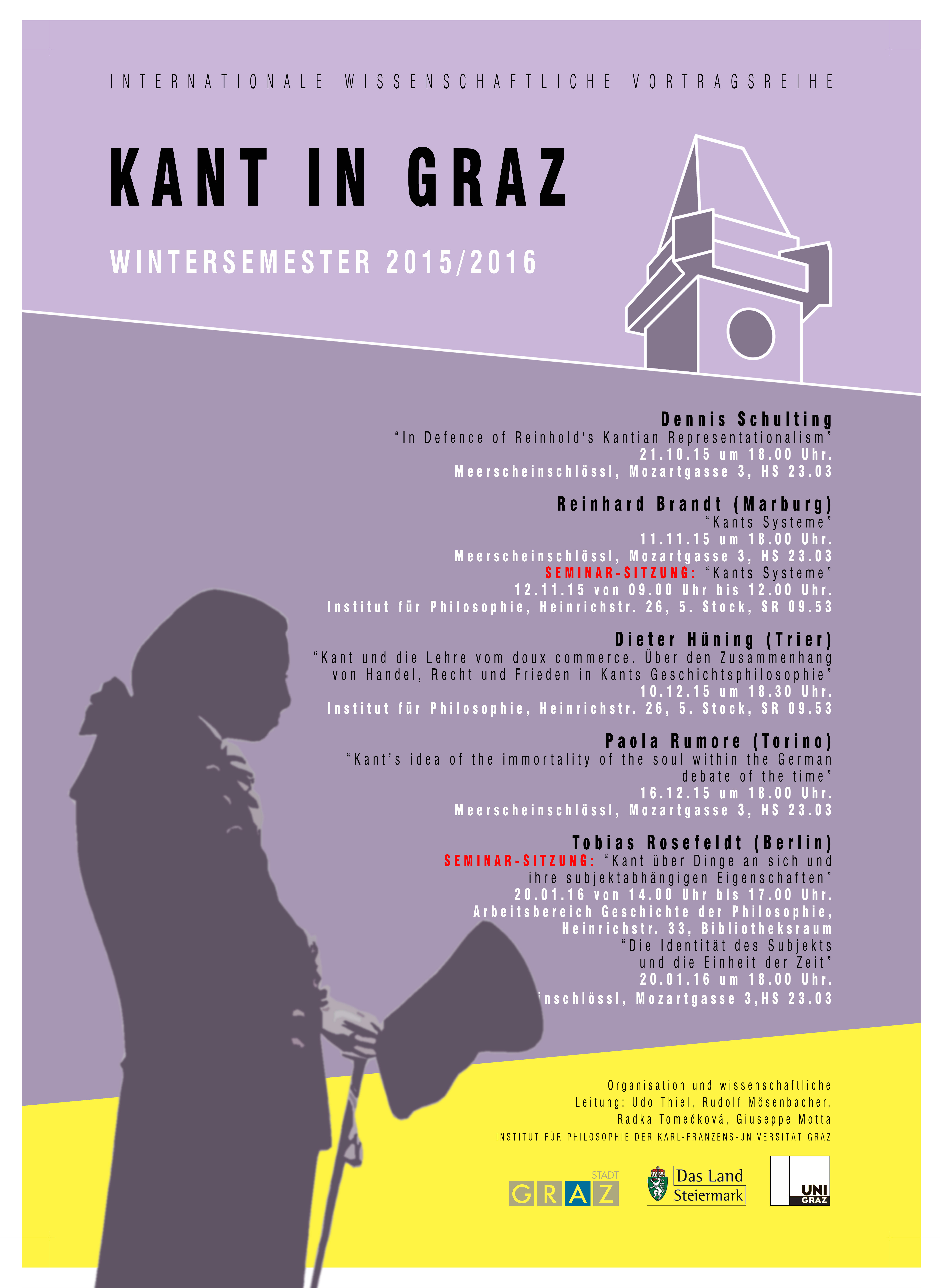 Dem Abendvortrag von Professor Rosefeldt wird ein intensiver StudentenWorkshop vorausgehen – mit der Intention Rosefelds allgemeines Verständnis von Kants Konzeption des transzendentalen Idealismus den Grazer Kantinteressenten zu erläutern.