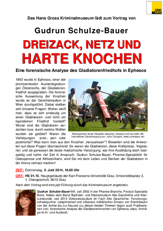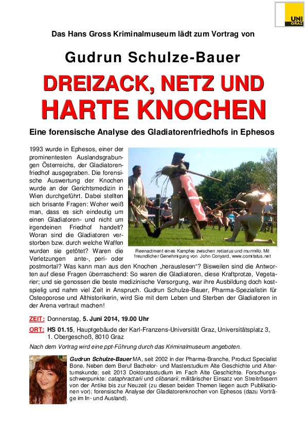1993 wurde in Ephesos, einer der prominentesten Auslandsgrabungen Österreichs, der Gladiatorenfriedhof ausgegraben. Die forensische Auswertung der Knochen wurde an der Gerichtsmedizin in Wien durchgeführt. Dabei stellten sich brisante Fragen: Woher weiß man, dass es sich eindeutig um einen Gladiatoren- und nicht um irgendeinen Friedhof handelt? Woran sind die Gladiatoren verstorben bzw. durch welche Waffen wurden sie getötet? Waren die Verletzungen ante-, peri- oder postmortal? Was kann man aus den Knochen „herauslesen“? Bisweilen sind die Antworten auf diese Fragen überraschend: So waren die Gladiatoren, diese Kraftprotze, Vegetarier; und sie genossen die beste medizinische Versorgung, war ihre Ausbildung doch kostspielig und nahm viel Zeit in Anspruch. Gudrun Schulze-Bauer, Pharma-Spezialistin für Osteoporose und Althistorikerin, wird Sie mit dem Leben und Sterben der Gladiatoren in der Arena vertraut machen!
