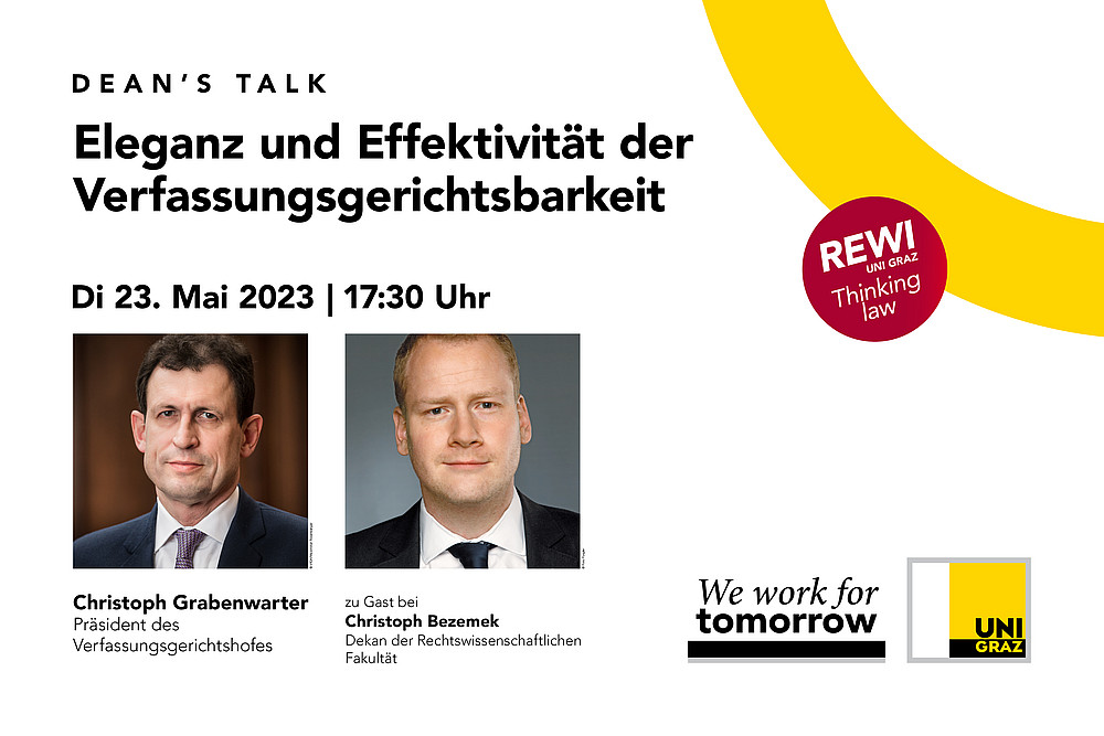 „Eleganz und Effektivität der Verfassungsgerichtsbarkeit“ lautet das Thema des nächsten Dean's Talk an der REWI der Uni Graz. Dekan Christoph Bezemek diskutiert mit dem Präsidenten des Verfassungsgerichtshofes Christoph Grabenwarter.