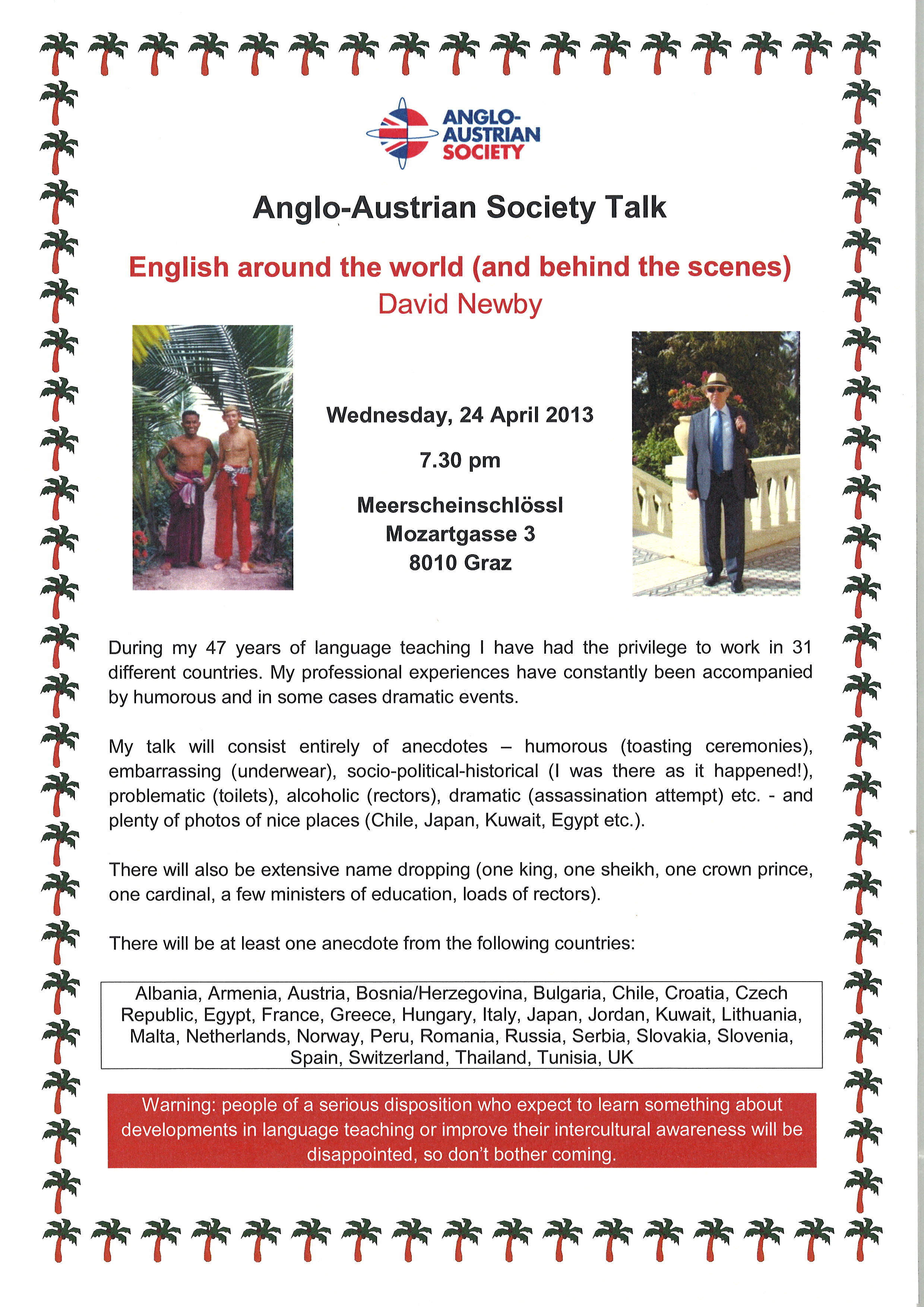 My talk will consist entirely of anecdotes – humorous (toasting ceremonies), embarrassing (underwear), socio-political-historical (I was there as it happened!), problematic (toilets), alcoholic (rectors), dramatic (assassination attempt) etc. - and plenty of photos of nice places (Chile, Japan, Kuwait, Egypt etc.).