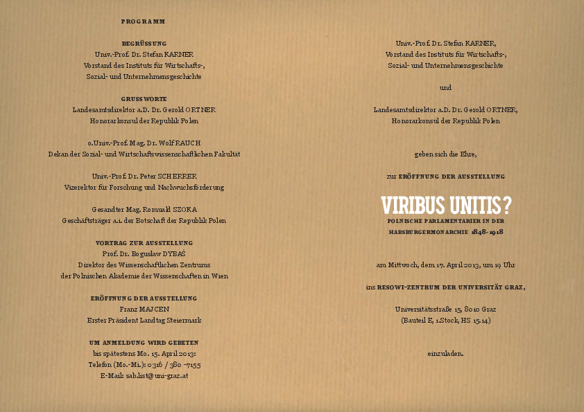 Namen wie Franciszek (Franz) Smolka, Kazimierz Badeni oder Agenor Gołuchowski, die dem Polenklub im Wiener Parlament angehörten, haben einen wichtigen Platz in der österreichischen Geschichte inne. „Viele Elemente der uns heute umgebenden und selbstverständlich erscheinenden Wirklichkeit verdanken wir ihren Entscheidungen – Schulen, Fabriken, Eisenbahnverbindungen“, weiß Univ.-Prof. Dr. Stefan Karner, Leiter des Instituts für Wirtschafts-, Sozial- und Unternehmensgeschichte der Karl-Franzens-Universität. Auf Initiative Karners und des Honorarkonsulats der Republik Polen macht die Ausstellung nach Stationen in Wien, München und mehreren polnischen Städten nun auch in Graz Halt. Entstanden ist die Schau in Kooperation zwischen dem Wissenschaftlichen Zentrum der Polnischen Akademie der Wissenschaften in Wien, der Parlamentsdirektion und dem Österreichischen Staatsarchiv.