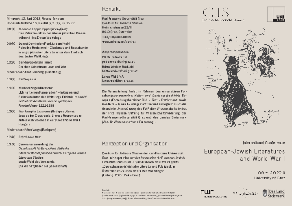 Das Centrum für Jüdische Studien der Karl-Franzens-Universität veranstaltet in Kooperation mit der Gesellschaft für Europäisch-jüdische Literaturstudien vom 10. bis 12. Juni eine internationale Tagung zum Thema European-Jewish Literatures and World War I. Zum ersten Mal befassen sich WissenschaftlerInnen aus verschiedenen Disziplinen (u. a. Anglistik, Germanistik, Geschichte, Jüdische Studien, Philosophie, Romanistik, Slawistik) vergleichend mit europäisch-jüdischen Literaturen in der Zeit des Ersten Weltkriegs. Im Zentrum der Auseinandersetzung stehen Fragen nach inhaltlichen, ästhetischen und medialen Spezifika unterschiedlicher literarischer und publizistischer Erzeugnisse sowie (literarische) Strategien der Sinnvermittlung und der Identitätskonzeption in Zeiten des Krieges. Als Keynote Speaker konnte Jay Winter (Yale University), einer der bedeutendsten Weltkriegsforscher, gewonnen werden. In Ergänzung zu den wissenschaftlichen Beiträgen wird die Wiener Schriftstellerin Claudia Erdheim ein dem Thema der Tagung entsprechendes Kapitel aus ihrem Roman „Längst nicht mehr koscher“ (2006) präsentieren.