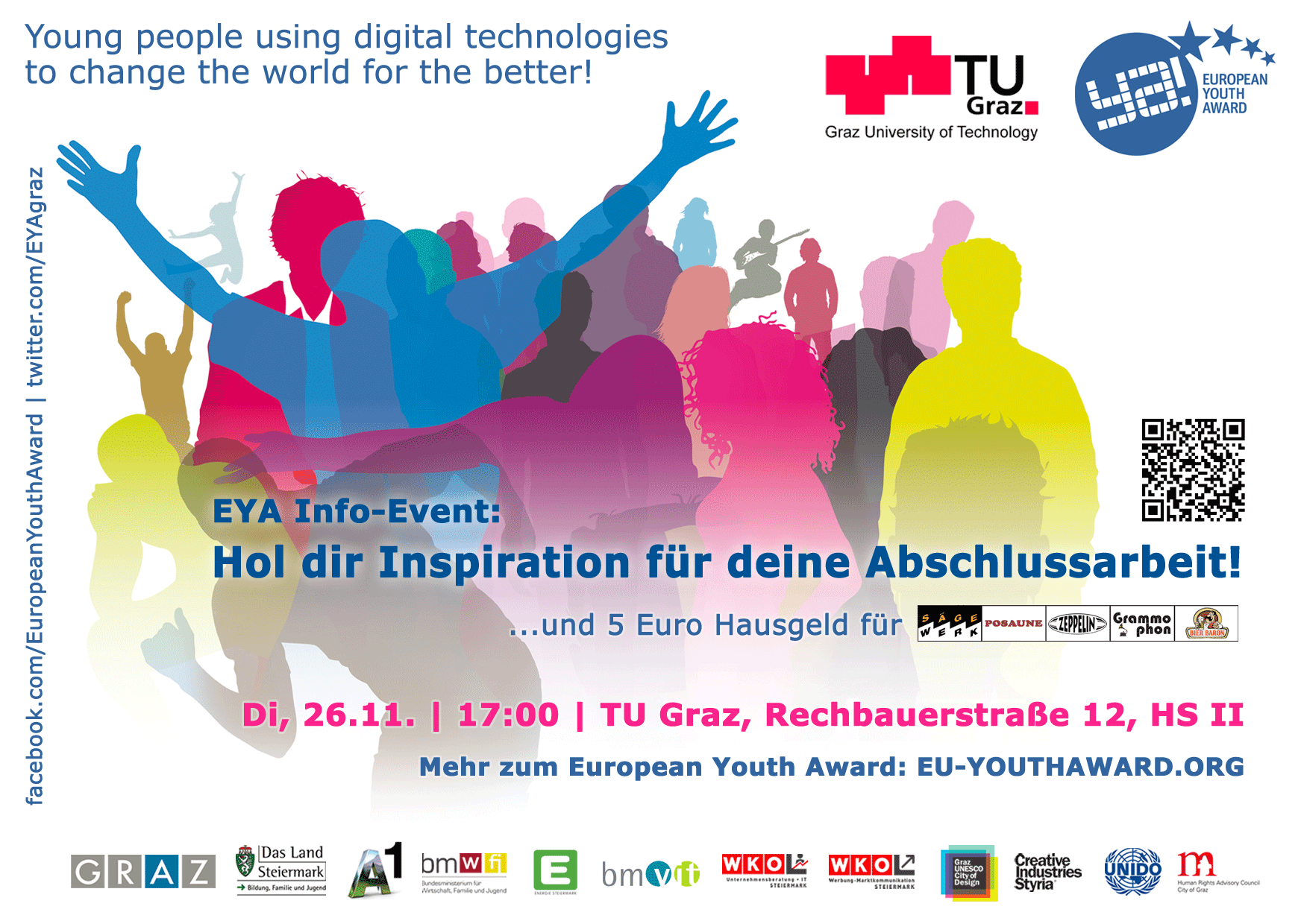 In Kooperation mit der TU Graz veranstalten wir für alle Studenten und Lehrkräfte in Graz (KFU, TU, Campus02 und FH Joanneum) ein Info-Event für den EYA am 26. November. Dabei werden die Möglichkeiten der Teilnahme am Wettbewerb, dem Gewinnerfestival, an internationalen Projekten mit Studenten aus ganz Europa, uvm. vorgestellt. der EYA ist eine einmalige Möglichkeit zu internationalem Networking!