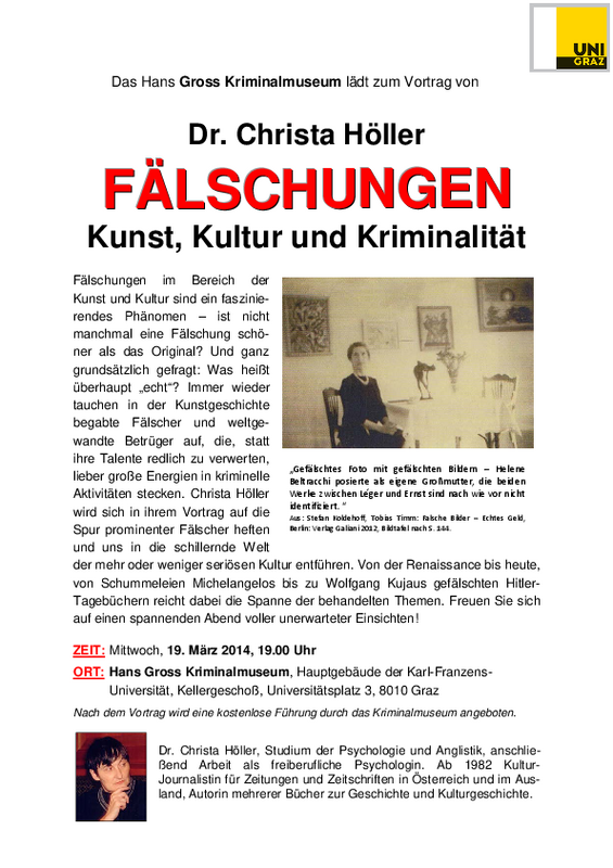 Fälschungen im Bereich der Kunst und Kultur sind ein faszinierendes Phänomen – ist nicht manchmal eine Fälschung schöner als das Original? Und ganz grundsätzlich gefragt: Was heißt überhaupt „echt“? Immer wieder tauchen in der Kunstgeschichte begabte Fälscher und weltgewandte Betrüger auf, die, statt ihre Talente redlich zu verwerten, lieber große Energien in kriminelle Aktivitäten stecken. Christa Höller wird sich in ihrem Vortrag auf die Spur prominenter Fälscher heften und uns in die schillernde Welt der mehr oder weniger seriösen Kultur entführen. Von der Renaissance bis heute, von Schummeleien Michelangelos bis zu Wolfgang Kujaus gefälschten Hitler-Tagebüchern reicht dabei die Spanne der behandelten Themen. Freuen Sie sich auf einen spannenden Abend voller unerwarteter Einsichten!