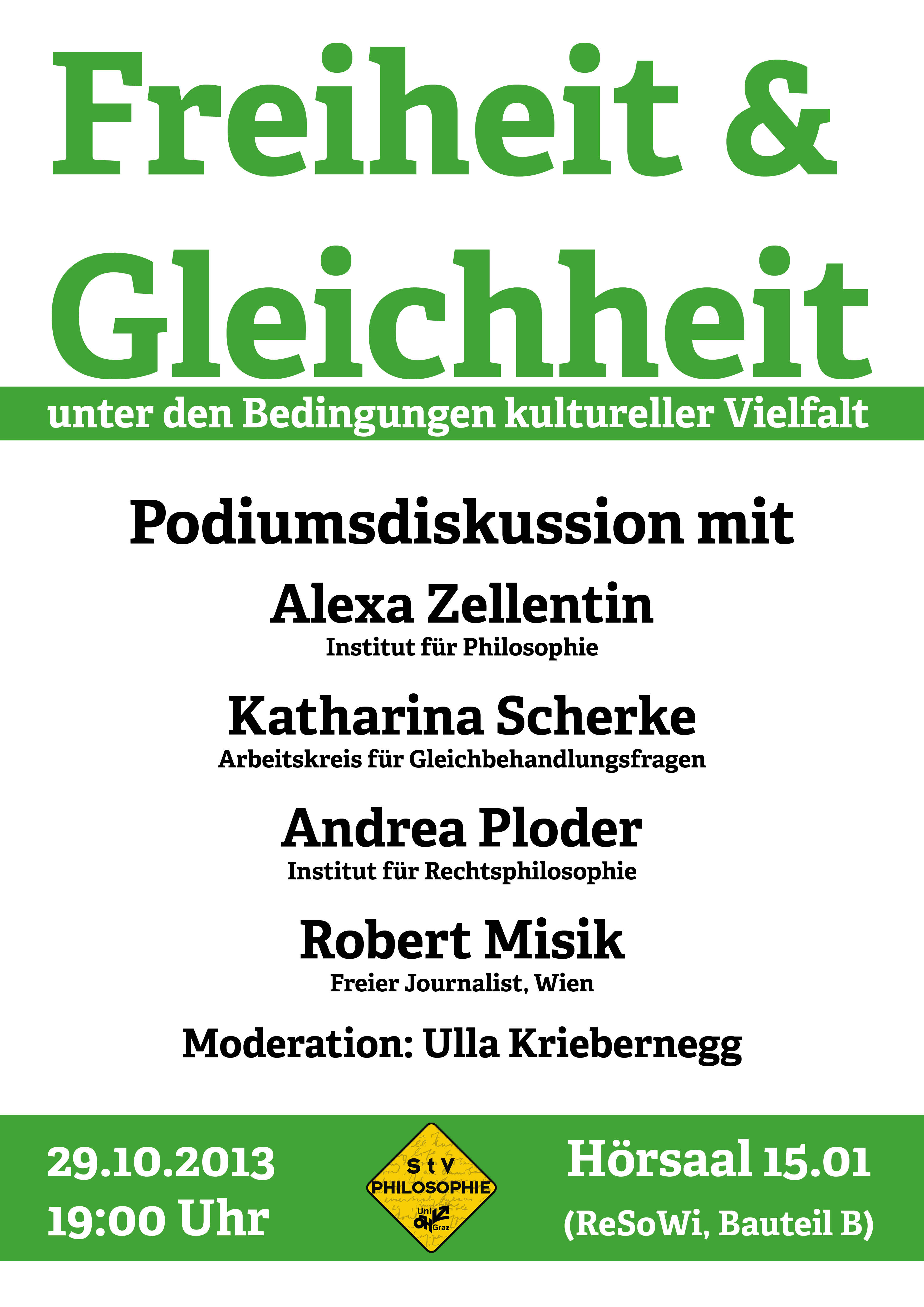 Wir möchten euch alle sehr herzlich zu unserer Podiumsdiskussion über Freiheit und Gleichheit unter den Bedingungen kultureller Vielfalt einladen. Am Podium diskutieren mit dem Publikum