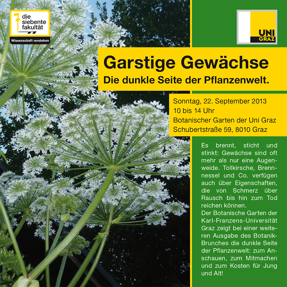 Es brennt, sticht und stinkt: Gewächse sind oft mehr als nur eine Augenweide. Tollkirsche, Brennnessel und Co. verfügen auch über Eigenschaften, die von Schmerz über Rausch bis hin zum Tod reichen können.Der Botanische Garten der Karl-Franzens-Universität Graz zeigt bei einer weiteren Ausgabe des Botanik-Brunches die dunkle Seite der Pflanzenwelt: zum Anschauen, zum Mitmachen und zum Kosten für Jung und Alt!