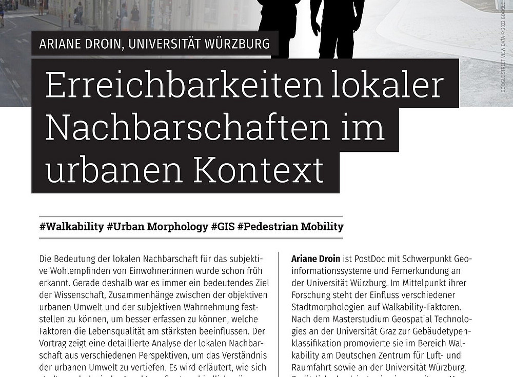 Die Bedeutung der lokalen Nachbarschaft für das subjektive Wohlempfinden von Einwohner:innen wurde schon früh erkannt. Gerade deshalb war es immer ein bedeutendes Ziel der Wissenschaft, Zusammenhänge zwischen der objektiven urbanen Umwelt und der subjektiven Wahrnehmung feststellen zu können, um besser erfassen zu können, welche Faktoren die Lebensqualität am stärksten beeinflussen. Der Vortrag zeigt eine detaillierte Analyse der lokalen Nachbarschaft aus verschiedenen Perspektiven, um das Verständnis