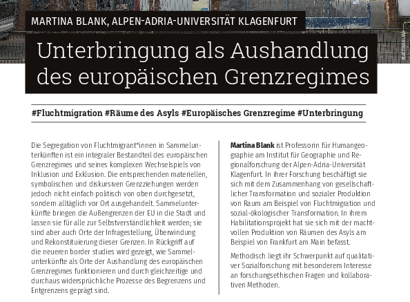Die Segregation von Fluchtmigrant*innen in Sammelunterkünften ist ein integraler Bestandteil des europäischen Grenzregimes und seines komplexen Wechselspiels von Inklusion und Exklusion. Die entsprechenden materiellen, symbolischen und diskursiven Grenzziehungen werden jedoch nicht einfach politisch von oben durchgesetzt, sondern alltäglich vor Ort ausgehandelt. Sammelunterkünfte bringen die Außengrenzen der EU in die Stadt und lassen sie für alle zur Selbstverständlichkeit werden; sie sind aber auch Orte der Infragestellung, Überwindung und Rekonstituierung dieser Grenzen. In Rückgriff auf die neueren border studies wird gezeigt, wie Sammelunterkünfte als Orte der Aushandlung des europäischen Grenzregimes funktionieren und durch gleichzeitige und durchaus widersprüchliche Prozesse des Begrenzens und Entgrenzens geprägt sind.