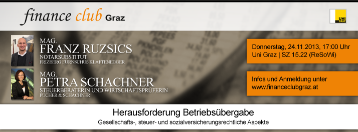 Zur Anmeldung: www.financeclubgraz.at/nc/event/n/gesellschafts-steuer-und-sozialversicherungsrechtliche-aspekte-einer-betriebsuebergabe/