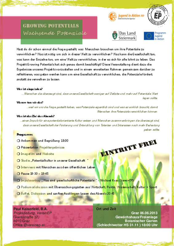 Hast du dir schon einmal die Frage gestellt, was Menschen brauchen um ihre Potentiale zu verwirklichen? Was ist nötig um sich in dieser Welt zu verwirklichen? Was kann die Gesellschaft tun, was kann der Einzelne tun, um eine Welt zu verwirklichen, in der es sich für alle lohnt zu leben. Das Projekt Growing Potentials hat sich genau damit beschäftigt! Diese Veranstaltung dient dazu die Ergebnisse unseres Projekts vorzustellen und in einem erweiterten Rahmen gemeinsam darüber zu reflektieren, was getan werden kann um eine Gesellschaft zu verwirklichen, die Potenziale fördert, anstatt sie verwelken zu lassen.