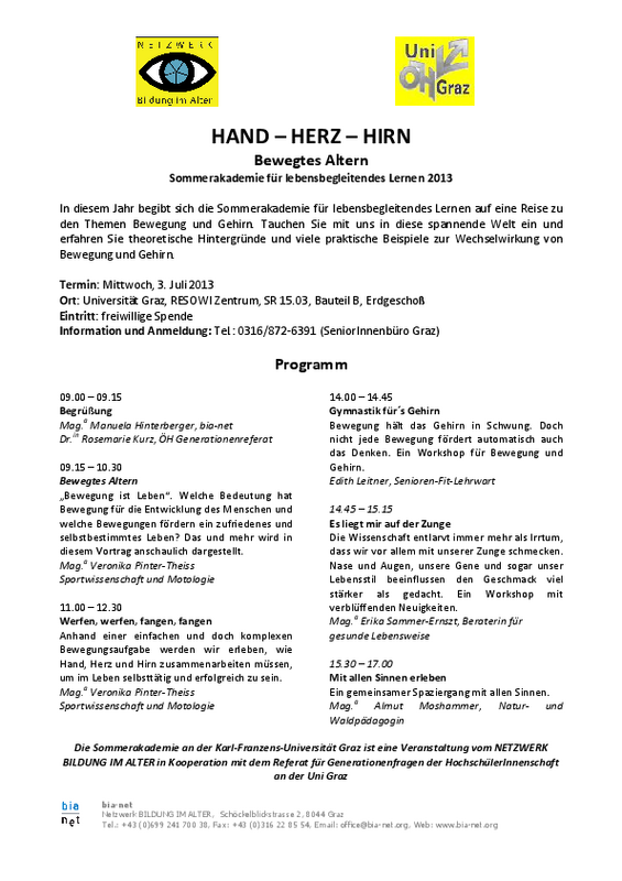 In diesem Jahr begibt sich die Sommerakademie für lebensbegleitendes Lernen auf eine Reise zu den Themen Bewegung und Gehirn. Tauchen Sie mit uns in diese spannende Welt ein und erfahren Sie theoretische Hintergründe und viele praktische Beispiele zur Wechselwirkung von Bewegung und Gehirn.