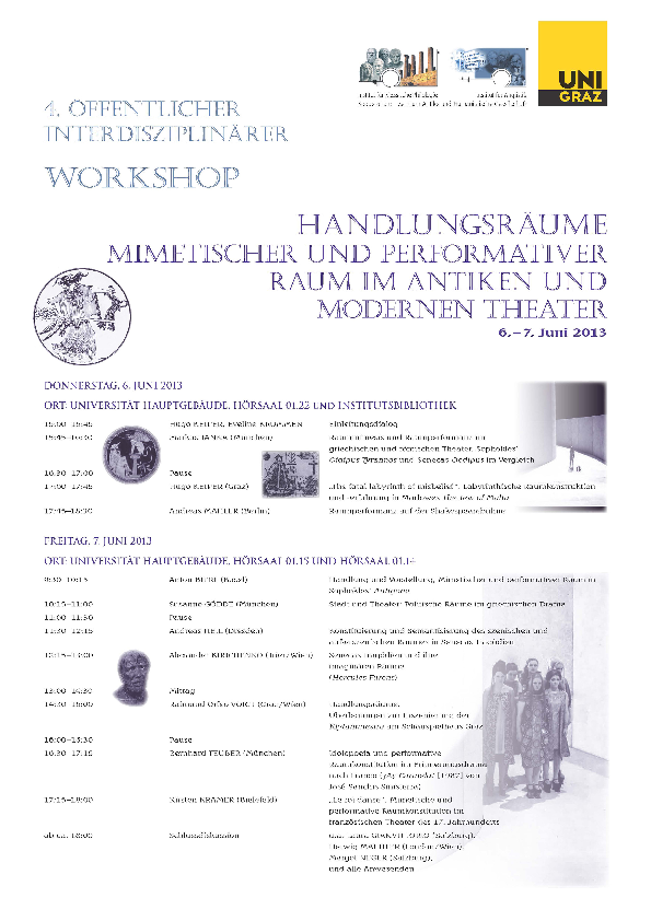 Theater und Raum gehören eng zusammen, ebenso wie Theater und Mimesis, die sich nicht nur in der Nachahmung von handelnden Menschen, sondern auch in der sprachlichen Imagination von Handlungen und in der Konstruktion von fiktiven Welten ausdrückt (Aristoteles, Poetik‚ Systasis tôn pragmátôn’). Raum und Mimesis werden in diesem Workshop konzeptionell miteinander verbunden. Es soll insbesondere untersucht werden, wie Räume im Drama einerseits beschrieben oder repräsentiert werden (z.B. im Prolog oder Botenbericht) und andererseits durch Handeln figuriert und konstruiert werden (z. B. durch Tanz, Gestik, Auftritt, Abtritt), wodurch ein Handlungsraum geschaffen wird. Welche Spannungen ergeben sich aus diesen unterschiedlichen Raumkonstruktionen, besonders wenn sie innerhalb desselben Stücks erfolgen und sich auf dieselben Räume beziehen? Welche Bedeutung haben sie? Gibt es weitere Formen der dramatischen Raumkonstruktion, zum Beispiel mit optischen oder akustischen Mitteln? Inwiefern greift die Konzeption des Raumes über den Theaterraum in den politisch-kulturellen Raum hinaus und bestimmt diesen (neu)? Schließlich ist, wie es fest zur Konzeption der Theater-Workshops in Graz gehört, der Verbindung von Textanalyse und Theaterpraxis besondere Aufmerksamkeit zu schenken und nach der konkreten performativen Umsetzung der Raumrepräsentation und –konstruktion im Stück zu fragen.