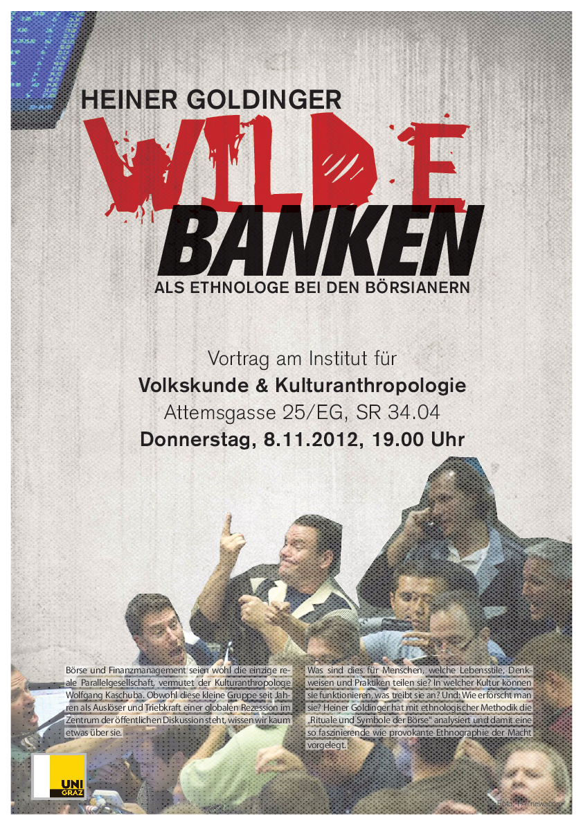 Heiner Goldinger hat mit ethnologischer Methodik die „Rituale und Symbole der Börse“ (so der Titel der 2002 erschienenen Dissertation) analysiert und damit eine so faszinierende wie provokante Ethnographie der Macht vorgelegt. Sein Vortrag am Institut für Volkskunde und Kulturanthropologie lässt spannende Einblicke und Diskussionen erwarten.