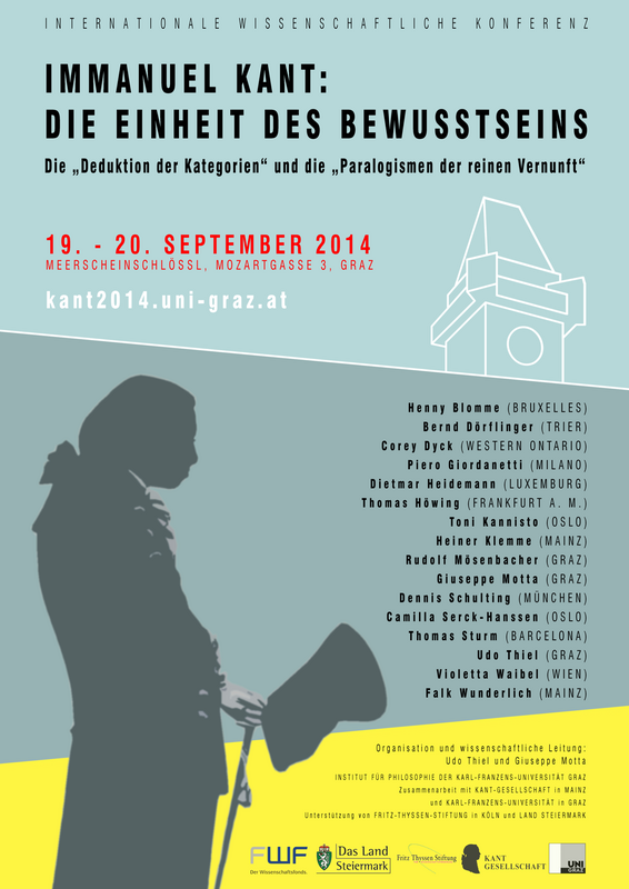 Die Erörterung dieses Themas wird im Laufe von zwei Tagen (19. - 20. September 2014) auf der Textgrundlage der Deduktionen der Kategorien (KrV, A 84-130, B 116-169) und der Paralogismen der reinen Vernunft (KrV, A 341-405, B 399-432) im Meerscheinschlössl (Mozartgasse 3, 8010 Graz) stattfinden. An der Tagung werden 16 WissenschafterInnen aus Österreich, Deutschland, Kanada, Italien, Benelux, Spanien, und Norwegen teilnehmen.