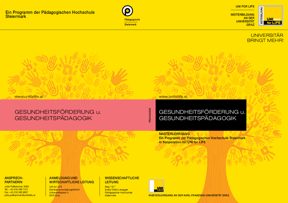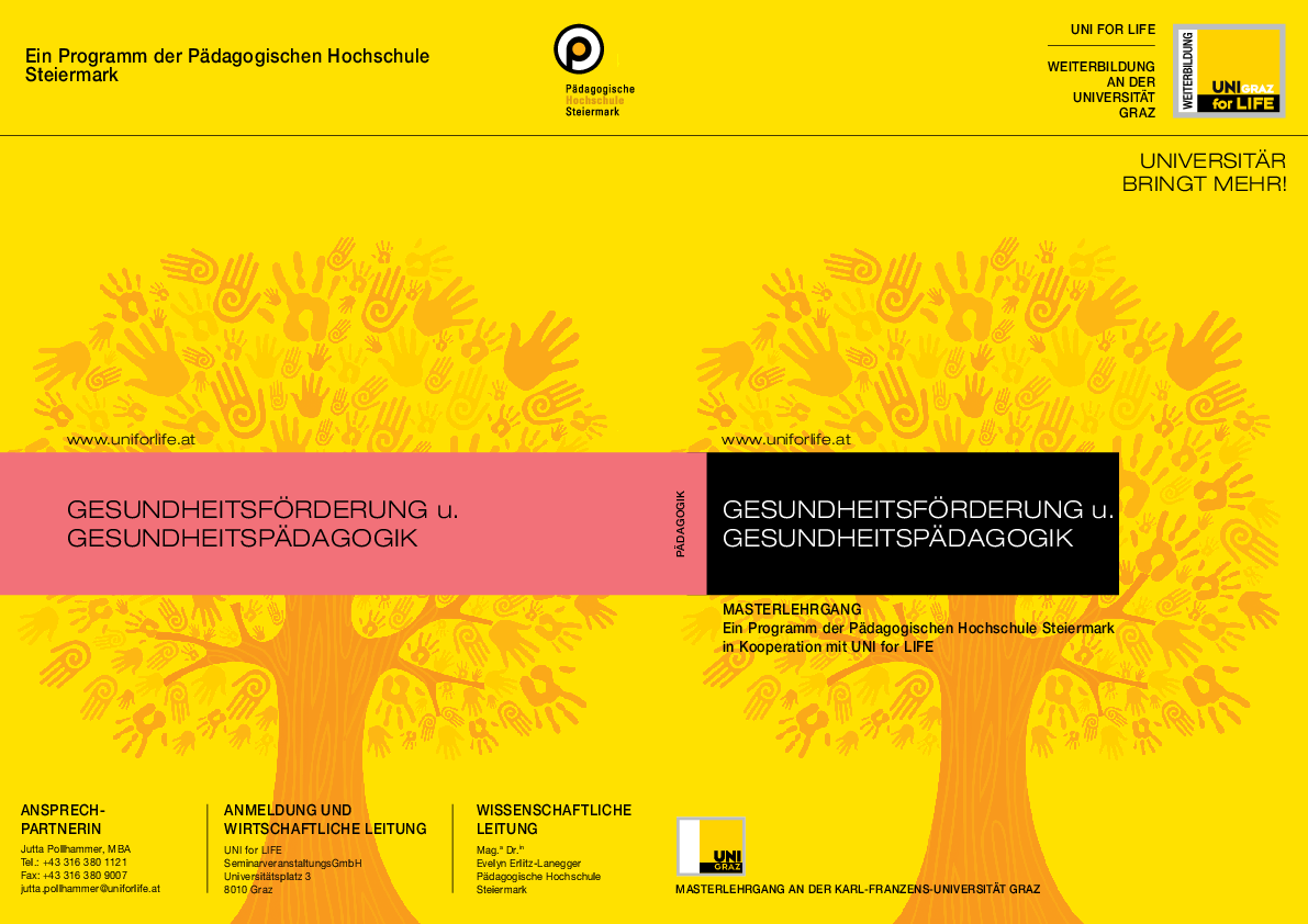 UNI for LIFE, die Weiterbildungsgesellschaft der UNI Graz, veranstaltet am 19.06.2013 um 18:00 Uhr einen Infoabend zum berufsbegleitenden Masterlehrgang "Gesundheitsförderung und -pädagogik".