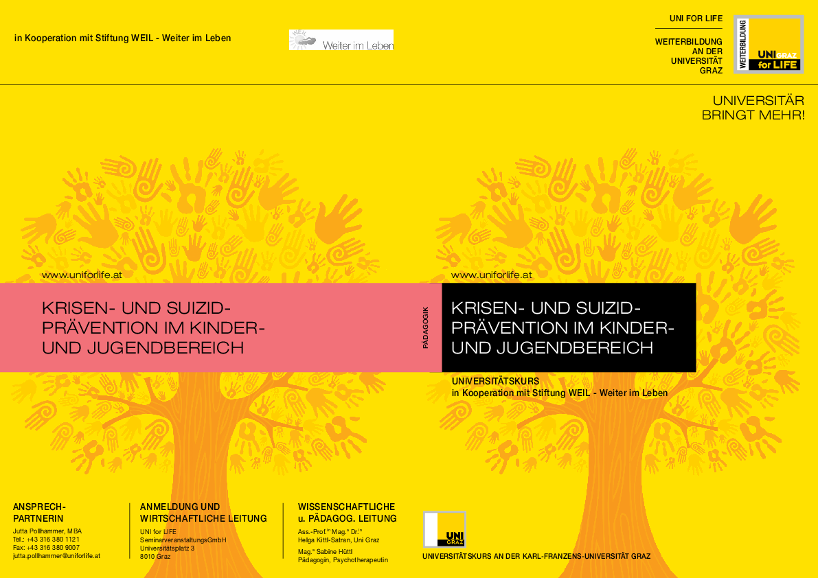 UNI for LIFE, die Weiterbildungsgesellschaft der UNI Graz, veranstaltet am 18.06.2013 um 18.00 Uhr einen Infoabend zum berufsbegleitenden Universitätskurs "Krisen-und Suizidprävention im Kinder- und Jugendbereich".