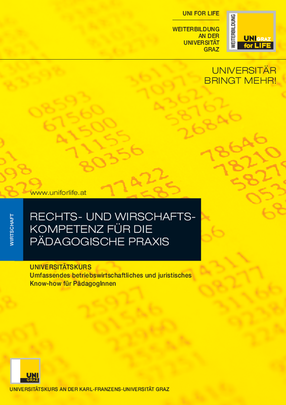 UNI for LIFE, die Weiterbildungsgesellschaft der Uni Graz, veranstaltet am 14. Jänner 2014 um 17.00 Uhr einen kostenlosen Infoabend zum berufsbegleitenden „Universitätskurs Rechts- und Wirtschaftskompetenz für die pädagogische Praxis“.
