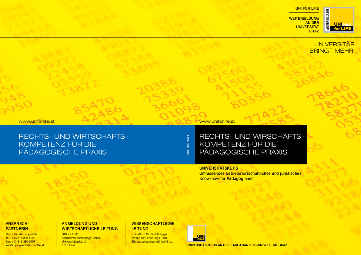 UNI for LIFE, die Weiterbildungsgesellschaft der Uni Graz, veranstaltet am 17. September 2013 um 18.00 Uhr einen kostenlosen Infoabend zum berufsbegleitenden „Universitätskurs Rechts- und Wirtschaftskompetenz für die pädagogische Praxis“.