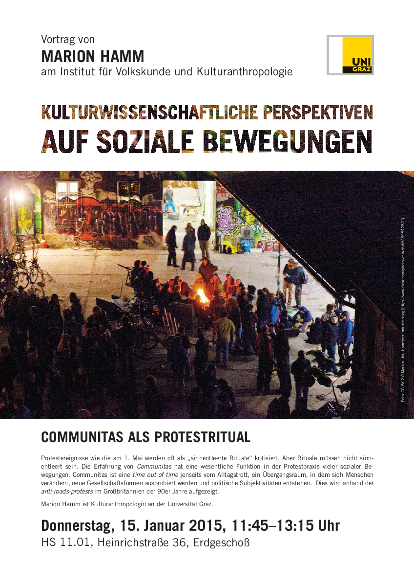 Protestereignisse wie die der Gewerkschaften am 1. Mai werden oft als „sinnentleerte Rituale“ kritisiert. Aber Rituale müssen nicht sinnentleert sein. Die Erfahrung von Communitas hat eine wesentliche Funktion in der Protestpraxis vieler sozialer Bewegungen. Communitas ist eine „time out of time“ jenseits vom Alltagstrott, ein Übergangsraum, in dem sich Menschen verändern, neue Gesellschaftsformen ausprobiert werden und politische Subjektivitäten entstehen. Dies wird anhand der anti-roads-protests im Großbritannien der 90er Jahre aufgezeigt.