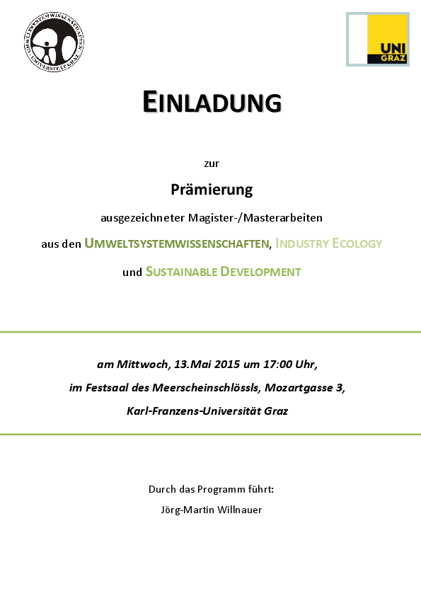 wir laden Sie recht herzlich zum Festakt im Rahmen der Prämierung ausgezeichneter Magister-/Masterarbeiten aus den Umweltsystemwissenschaften, Industry Ecology und Sustainable Development ein. Diese findet am Mittwoch, 13.Mai 2015 um 17:00 Uhr, im Festsaal des Meerscheinschlössls, Mozartgasse 3, Karl-Franzens-Universität Graz, statt.