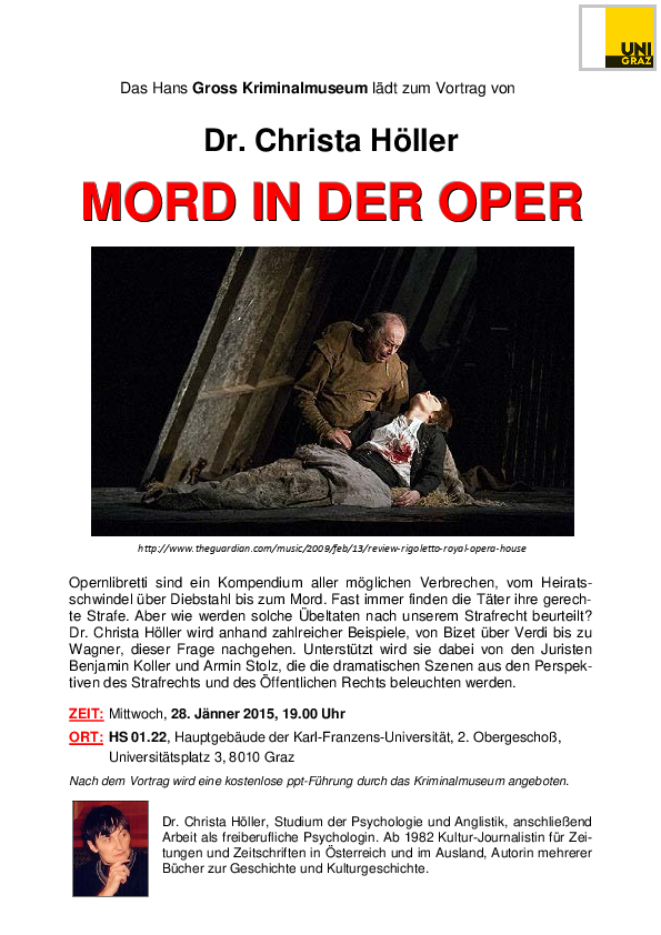 Opernlibretti sind ein Kompendium aller möglichen Verbrechen, vom Heiratsschwindel über Diebstahl bis zum Mord. Fast immer finden die Täter ihre gerechte Strafe. Aber wie werden solche Übeltaten nach unserem Strafrecht beurteilt? Dr. Christa Höller wird anhand zahlreicher Beispiele, von Bizet über Verdi bis zu Wagner, dieser Frage nachgehen. Unterstützt wird sie dabei von den Juristen Benjamin Koller und Armin Stolz, die die dramatischen Szenen aus den Perspektiven des Strafrechts und des Öffentlichen Rechts beleuchten werden.