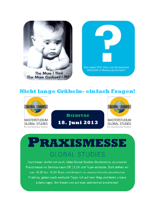 Die Studierenden der Praxisanalyse Global Studies veranstalten am 18. Juni 2013 eine Praxismesse, bei der sie Ihre unterschiedlichen Praktika vorstellen.