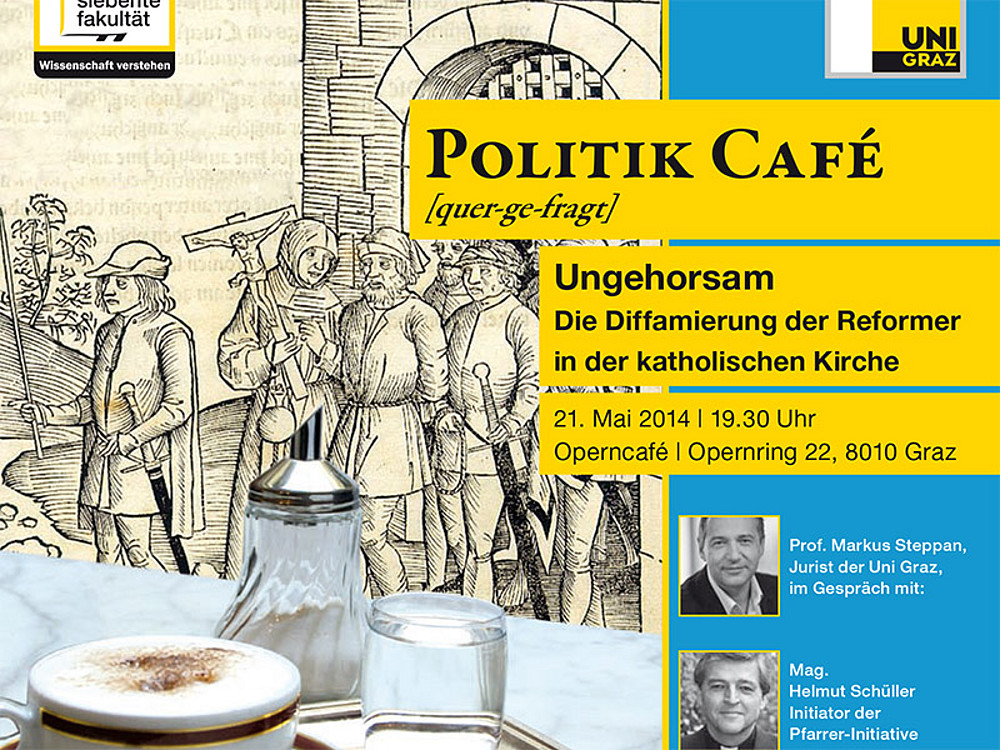 Sein Aufruf zum „Ungehorsam“ hat für Schlagzeilen gesorgt. Im Politik Café der Uni Graz am 21. Mai 2014 beleuchtet Helmut Schüller, Begründer der Pfarrer-Initiative, die Hintergründe und diskutiert mit Rechtswissenschafter Markus Steppan und dem Publikum „Die Diffamierung der Reformer in der katholischen Kirche“.