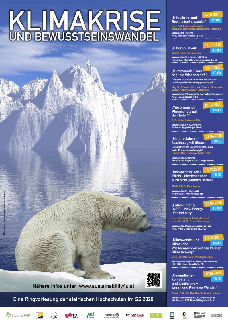 Unter dem Titel „KLIMAKRISE UND BEWUSSTSEINSWANDEL“ laden die neun steirischen Hochschulen unter der Federführung des Universitätenverbunds „Sustainability4U“ der vier Grazer Universitäten (Karl-Franzens-Universität, Technische Universität, Medizinische Universität, Kunstuniversität Graz) im Sommersemester 2020 zu einer Ringvorlesung ein. ExpertInnen aus verschiedenen Disziplinen präsentieren ihren Zugang zu nachhaltiger Entwicklung und erläutern Lösungsvorschläge für die Klimakrise, welche zusammen mit dem Publikum diskutiert werden sollen.
