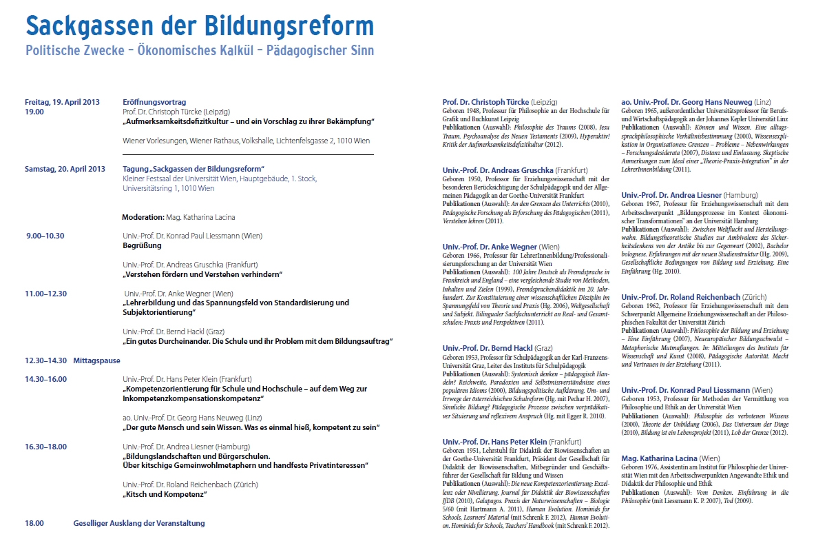Samstag, 20. April 2013, Beginn: 9:00 Uhr Tagung „Sackgassen der Bildungsreform“