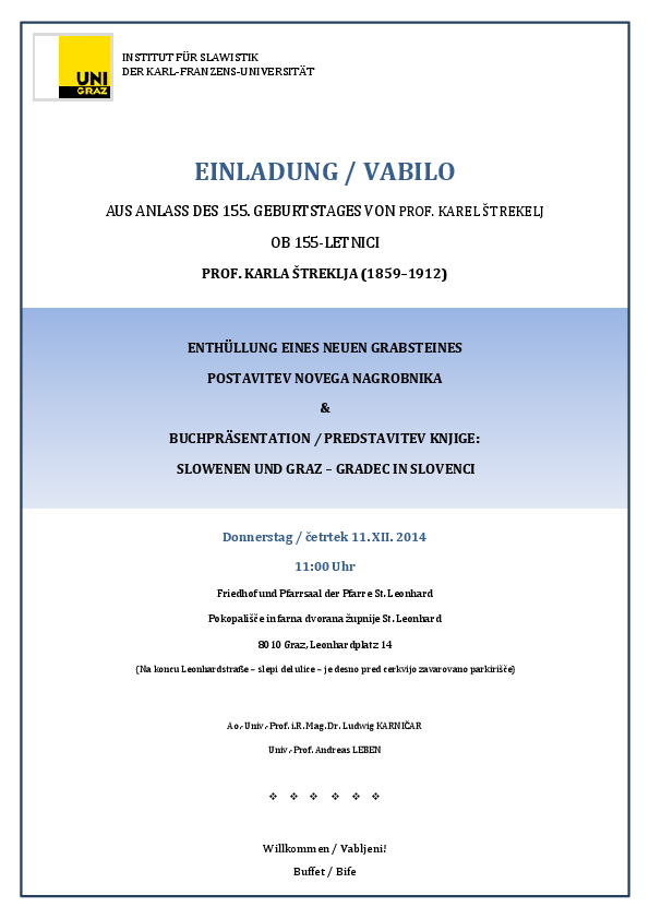 Heute um 11 Uhr wird zum 155. Geburtstag des Grazer Professors Karel Štrekelj (1859-1912) auf dem Grazer Friedhof St. Leonhard ein neuer Grabstein für den verdienstvollen Slawisten enthüllt. Štrekelj war ab 1896 als außerordentlicher Professor und ab 1908 als ordentlicher Professor der slawischen Philologie mit besonderer Berücksichtigung der slowenischen Sprache und Literatur an der Universität Graz tätig.