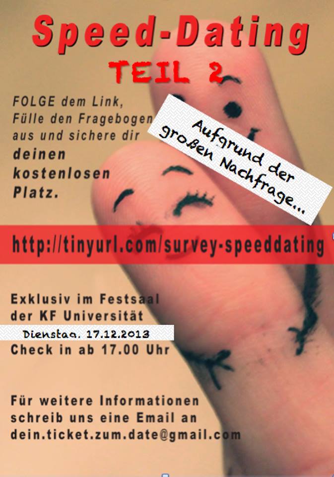 Nimm teil an einem unserer exklusiven und kostenlosen Speed-Dates im Festsaal der Karl-Franzens Universität. Alles was du dafür tun musst: Folge dem Link (http://tinyurl.com/survey-speeddating) fülle die Online-Umfrage aus und schon hast du dir einen Platz gesichert!