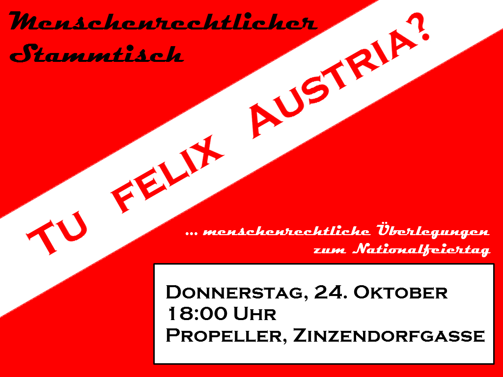 Der Stammtisch findet in unregelmäßigen Abständen mehrmals im Laufe eines Studienjahres statt, ganz informell am ETC oder aber - je nach Jahreszeit und Wetter - im Wirtshaus, Café oder Gastgarten. Teilnehmen können alle, die Interesse an Menschenrechten im Allgemeinen oder jeweils am Thema eines Abends haben. Zur Koordination und zum Informationsaustausch gibt's auch eine Facebook-Gruppe.