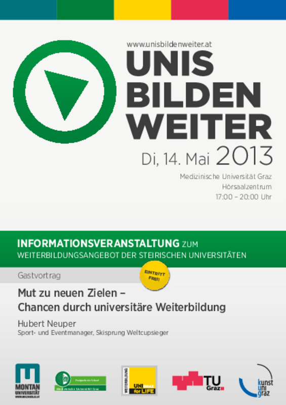 Als Gastredner konnte der Steirische Sport- und Eventmanager Hubert Neuper gewonnen werden. Er wird zum Thema "Mut zu neuen Zielen - Chancen durch universitäre Weiterbildung" einen interessanten und spannenden Einblick in seinen abwechslungsreichen Lebenslauf geben und dem interessierten Publikum die Notwendigkeit von persönlicher Entwicklung und Weiterbildung am Beispiel seiner Person erläutern. Abgerundet wird das interessante Programm durch eine Interviewrunde mit AbsolventInnen verschiedener Universitätslehrgänge, sowie der Möglichkeit zur persönlichen Beratung an den Infoständen der Universitäten.