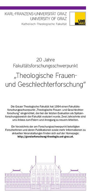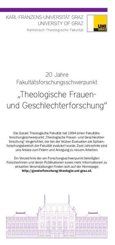 Die Grazer Theologische Fakultät hat 1994 einen Fakultätsforschungsschwerpunkt "Theologische Frauen- und Geschlechterforschung" eingerichtet, der bei der letzten Evaluation als Spitzenforschungsbereich der Fakultät evaluiert wurde. Zwei Jahrzehnte sind uns Anlass zum Feiern und Anregung zu neuem Arbeiten.