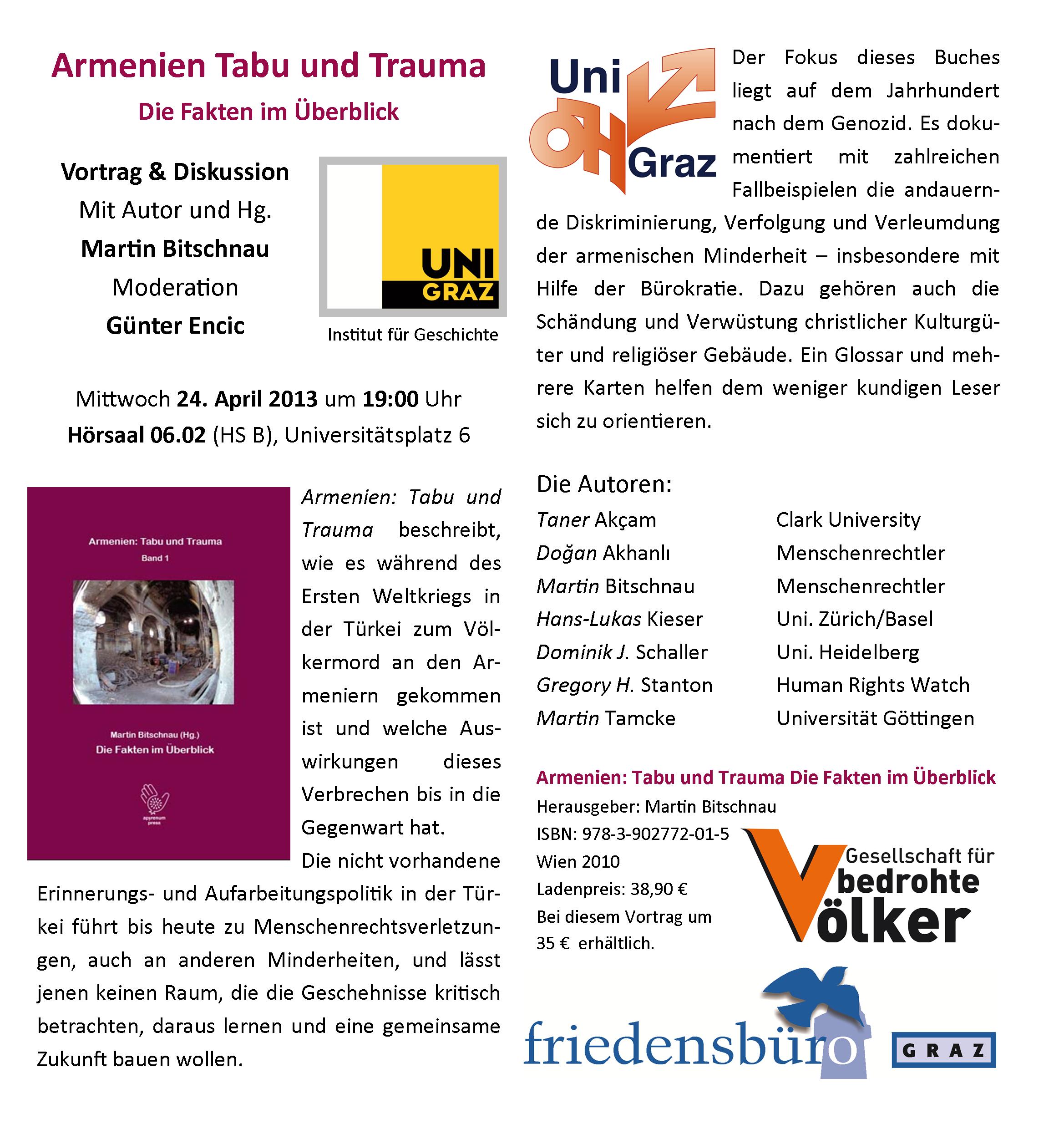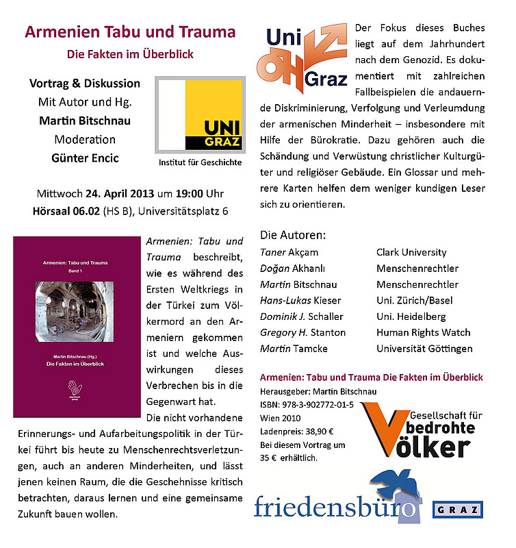 Der Völkermord (= Genozid) an den Armeniern ist Fakt. Er wurde von zahlreichen Historikern, Journalisten und Betroffenen dokumentiert. Doch in den Geschichtsbüchern der Türkei kommt er nicht vor. Seine Anerkennung widerspricht der türkischen Staatsdoktrin. Das bekommen jene Türken zu spüren, die nicht dieser Ansicht sind. Die systematischen Massenmorde an den Armeniern während des Ersten Weltkriegs waren der Ausgangspunkt für die UN-Genozid-Konvention. Doch gibt es heute noch Länder, die den Genozid an den Armeniern nicht anerkannt haben. Dazu zählt auch Österreich, dessen Parlament auf Druck des Außenministeriums eine Anerkennung verweigerte. Dabei war Österreich Kronzeuge bei diesen schrecklichen Ereignissen. Österreichische Diplomaten berichteten entsetzt über die »Exterminierung der armenischen Rasse«. Franz Werfel machte die armenische Tragödie mit seinem Buch »Die vierzig Tage des Musa Dagh« weltweit bekannt. Doch heute fragen österreichische Spitzenpolitiker: »Was haben wir damit zu tun?« Die Nachkommen der Opfer, aber auch der Täter haben ein Recht auf unverfälschte Geschichte. Nur dann ist eine unbelastete Zukunft möglich.