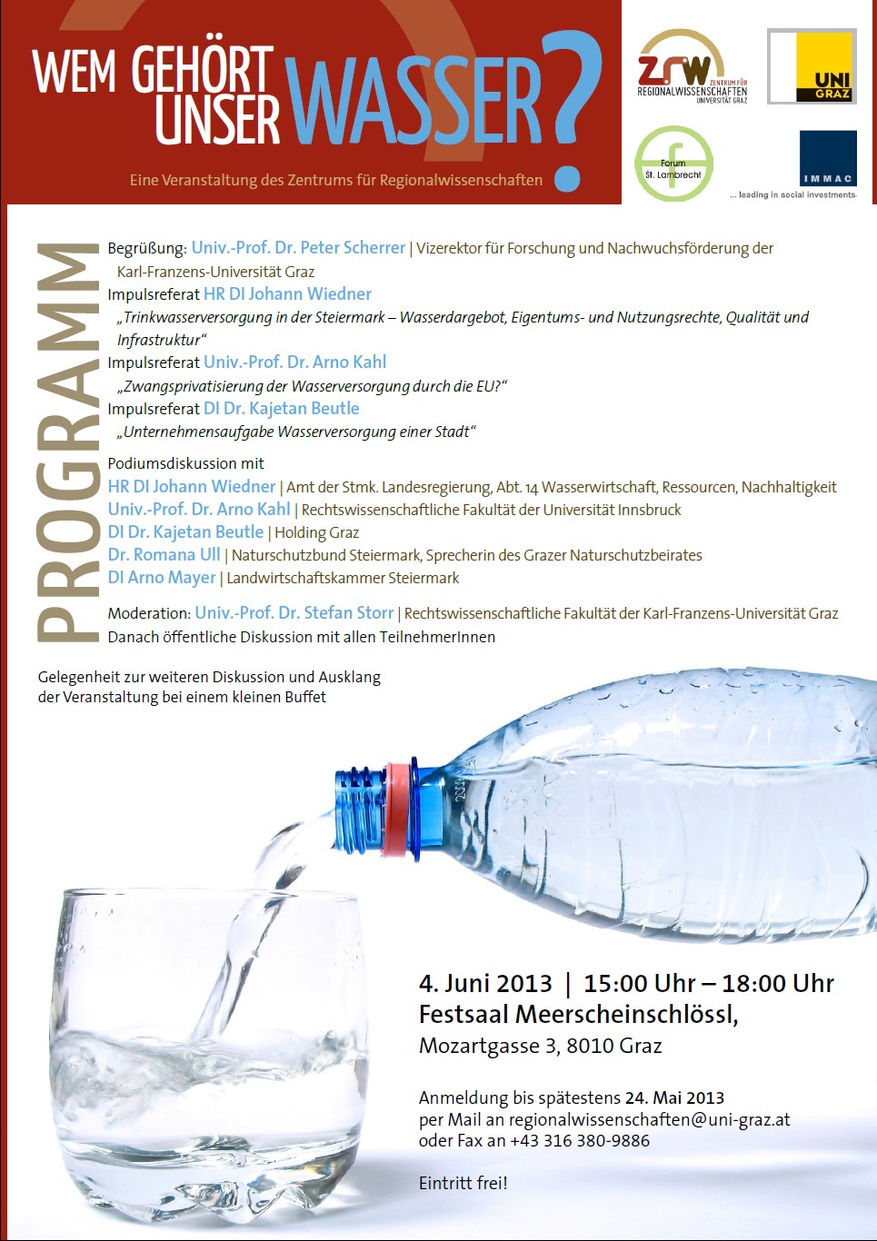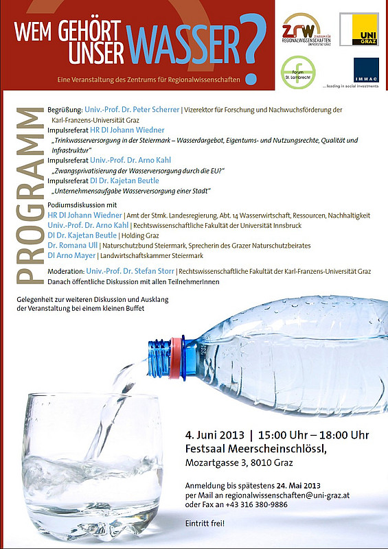 Die Veranstaltung richtet sich an alle steirischen GemeindevertreterInnen, politischen Parteien, Wasserversorgungsunternehmen, Wasserverbände, Umweltschutz- und Naturschutzverbände und Interessierte.