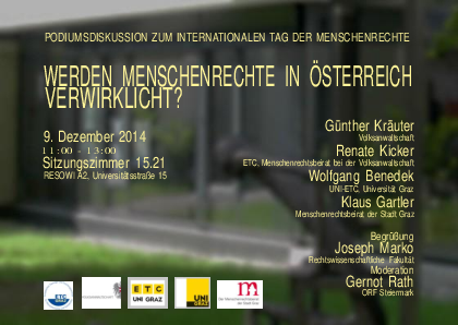 Es diskutieren Günther Kräuter (Volksanwaltschaft), Renate Kicker (ETC, Menschenrechtsbeirat bei der Volksanwaltschaft), Wolfgang Benedek (UNI-ETC, Universität Graz) und Klaus Gartler (Menschenrechtsbeirat der Stadt Graz, tbc).