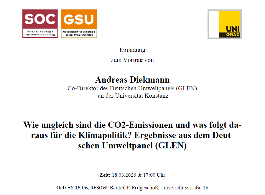 Surveystudien zum Umweltverhalten basieren oft auf einfachen Indikatoren für „intentional-orientiertes“ Umweltverhalten (Stern 2000) wie Recycling, Energiesparen, Nutzung öffentlicher Verkehrsmittel usw., die nur in begrenztem Umfang mit den Emissionen der Haushalte korrelieren. Im Gegensatz dazu versucht das Deutsche Umweltpanel (GLEN) die tatsächlichen individuellen CO2-Emissionen in den Bereichen Wohnen, Mobilität, Ernährung und Konsum zu er-fassen. Ein Schwerpunkt der Analyse liegt auf der Verteilung der Emissionen und ihrem Zusam-menhang mit Einkommen, Umweltbewusstsein und intentional-orientiertem Umweltverhalten. Die Daten liefern auch Informationen zu klimapolitischen Optionen. Es ist bekannt, dass CO2-Bepreisung wirksam ist, um Emissionen von Haushalten und Industrie zu reduzieren. Allerdings ist die CO2-Besteuerung selbst mit Pro-Kopf-Rückverteilung unpopulär und eine Mehrheit der Befragten bezweifelt sogar die Wirksamkeit der CO2-Bepreisung. Wie kann dieses Dilemma gelöst und wie können wirksame politische Maßnahmen gestaltet werden? Umfrageexperimente können Einblicke in die Akzeptanz von Reduktionsstrategien geben. Unsere Daten zeigen, dass Fairnessüberlegungen entscheidend für die politische Akzeptanz sind. Auf der Grundlage unserer Ergebnisse und der Literatur werde ich Vorschläge für faire und wirksame Maßnahmen zur Eindämmung des Klimawandels zur Diskussion stellen.