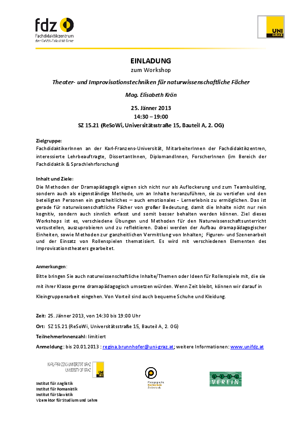 Bitte bringen Sie auch naturwissenschaftliche Inhalte/Themen oder Ideen für Rollenspiele mit, die sie mit ihrer Klasse gerne dramapädagogisch umsetzen würden. Wenn Zeit bleibt, können wir darauf in Kleingruppenarbeit eingehen. Von Vorteil sind auch bequeme Schuhe und Kleidung.