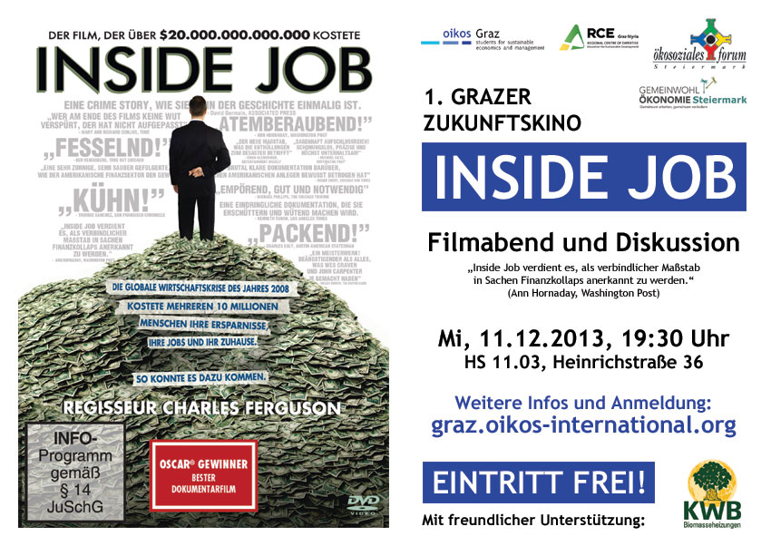Drei Mal pro Semester veranstaltet oikos Graz gemeinsam mit Partnern das „1. Grazer Zukunftskino“. Dort werden Filme gezeigt, die sich den brennendsten Fragen unserer Zeit widmen und dabei die engen Zusammenhänge zwischen Wirtschaft, Mensch und Natur in den Fokus rücken. Offene Fragen können im Anschluss mit einem/einer Expert/in aus dem jeweiligen Bereich diskutiert werden.