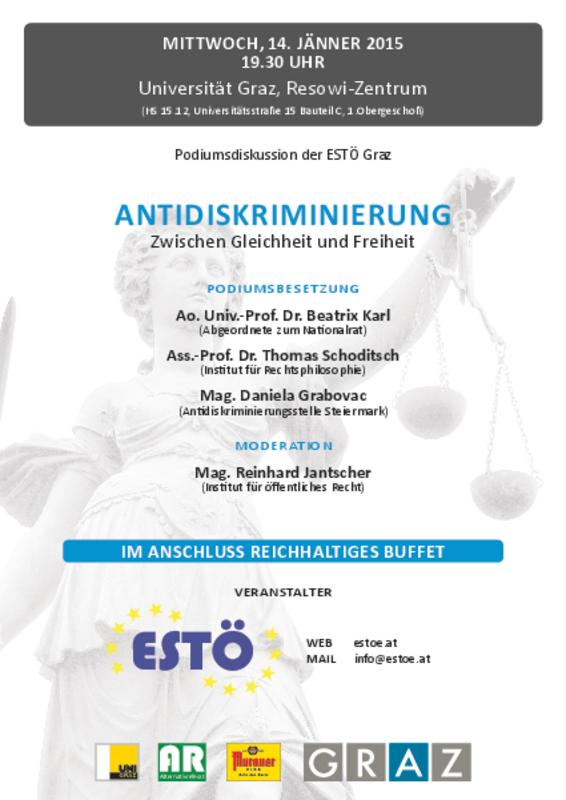 Es diskutieren die Nationalratsabgeordnete Prof. Dr. Beatrix Karl, Ass.-Prof. Dr. Thomas Schoditsch und Mag. Daniela Grabovac von der Antidiskriminierungsstelle Steiermark.